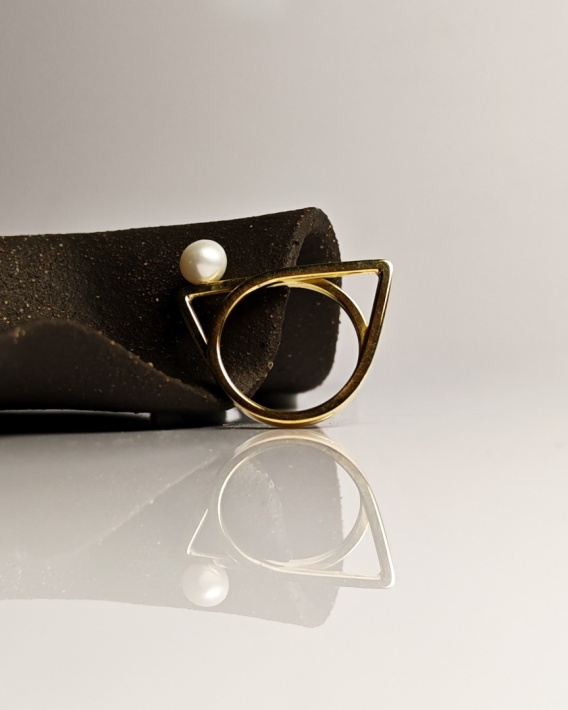 Autorski pierścionek, w którym klasyczne pojęcie formy zostało przesunięte o milimetr – wystarczająco, by stał się inny. Geometryczna kompozycja z mosiądzu tworzy własny rytm, a pojedyncza perła hodowana wprowadza w niego spokój i miękkość.