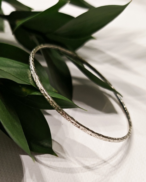 Ręcznie formowana bransoletka bangla ze srebra 925 o młotkowanej strukturze. Delikatny owal dopasowany do nadgarstka.