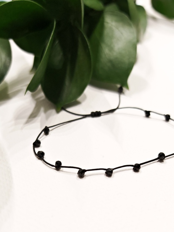 Materiał: nić nylonowa Kamień: czarny turmalin, 2 mm Technika: ręczne wykonanie, autorska metoda supełkowania