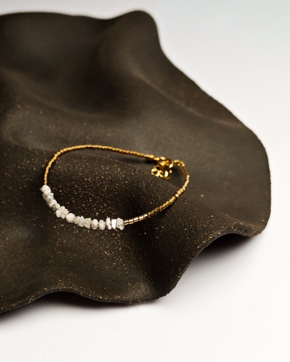 Delikatna, a jednocześnie wyrazista – bransoletka z białymi surowymi diamentami, zestawionymi z drobnymi, złocistymi wałeczkami hematytu.