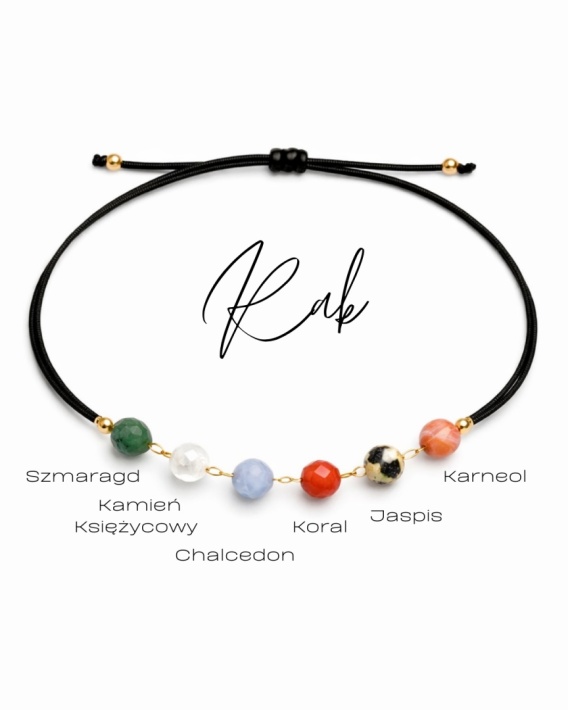 Bransoletka Zodiak Rak z kolekcji Twój Zodiak to połączenie łańcuszka ze stali oraz nici nylonowej, uzupełnione naturalnymi kamieniami dobranymi jako symboliczne odniesienie do tego znaku. Spokojna, regulowana forma podkreśla wrażliwość, uważność i potrzebę równowagi, pozostając osobistym wyborem, a nie gotową definicją.