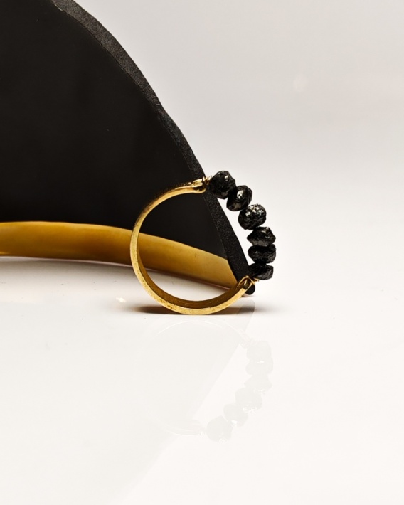 Pierścionek z surowymi czarnymi diamentami, oparty na prostej, autorskiej formie blaszki z mosiądzu.