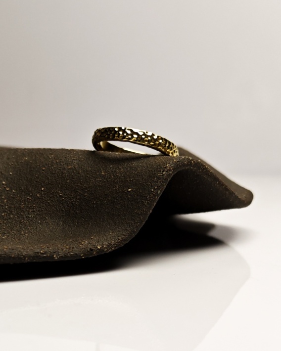 Pierścionek z mosiądzu o frezowanej strukturze. Klasyczny, prosty i ponadczasowy – z subtelnym połyskiem i wyraźnym charakterem.