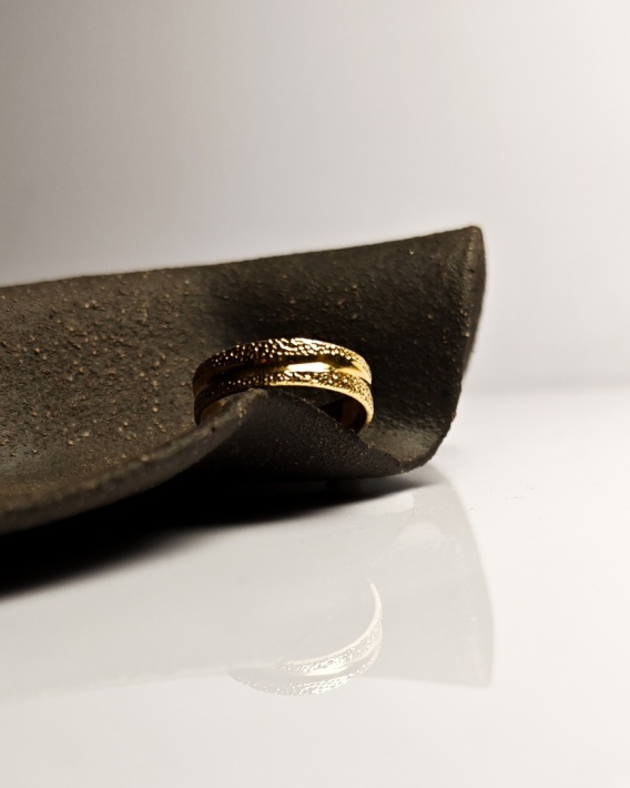 Pierścionek z mosiądzu z ręcznie punktowaną strukturą i subtelnym wgłębieniem pośrodku. Autorski projekt o wyraźnym, surowym charakterze.