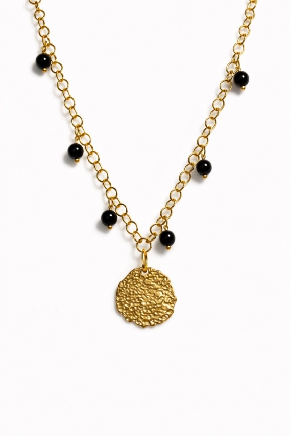 Naszyjnik GLAM Rolo z czarnym onyksem i okrągłą zawieszką o młotkowanej strukturze. Kamienie umieszczone w dolnej części naszyjnika. Do wyboru kolor złoty lub srebrny.